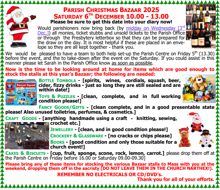 Would ALL our regular Servers, Readers, and Welcomers please make a point of looking at the Christmas Ministries Rota at the rear of the church. As well as the Masses over Christmas there are other readers needed for our Parish Carol Service and the traditional Readings and Carols before Midnight Mass. Hopefully the slots will all be filled in by the Parish Carol Service this weekend. Thank you.