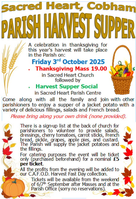Traditionally in the Church the month of November is a period of time dedicated to prayer for the Holy Souls in purgatory (those not yet in the presence of God but destined to be).                                                                                                              The Church commemorates all her faithful children who have departed this life, but have not yet attained the joys of heaven. St Paul warns us that we must not be ignorant concerning the dead, nor sorrowful, “even as others who have no hope . . . . for the Lord himself shall come down from heaven . . . . and the dead who are in Christ shall rise.” The Church has always taught us to pray for those who have gone into eternity. Even in the Old Testament prayers and alms were offered for the souls of the dead by those who thought “well and religiously concerning the resurrection.” It was believed that “they who had fallen asleep with godliness had great grace laid up for them” and that “it is therefore a holy and wholesome thought to pray for the dead, that they may be loosed from sins.” We know that a defiled soul cannot enter into heaven.                                                                                                 NOVEMBER BOOK OF THE DEAD                                                - As usual Parishioners who have taken the time to complete a ‘Dead List’ for any family or friends who have died since last November will now be able to ‘look up’ the names in our Parish Book of the Dead; which will be placed on the sanctuary throughout November. Each weekend during November one of our Masses will be celebrated for the Holy Souls.                                                                                                 NOVEMBER BLESSING OF GRAVES                                   - Our annual Blessing of Graves will take place next Sunday (9th November) at 15.30 (Cobham Cemetery, by the chapel entrance). After the short service there will be tea and scones available back at the Sacred Heart Parish Centre.
