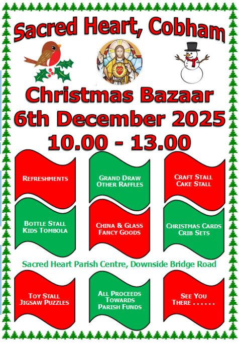 CHRISTMAS BAZAAR GRAND DRAW TICKETS                                   - If you were not able to collect Christmas Grand Draw Tickets after Mass over the last two weekends please make a point of collecting then as you leave Mass this weekend. ALL parishioners are being asked to take four books of tickets to try and sell to family, friends, and work colleagues over the next few weeks before the ‘big event.’ The Grand Draw is the major ‘money spinner’ of the Bazaar and we hope to have sold as many tickets as possible before the doors open on the day; this is also a way of everyone in our community getting involved! Don’t forget that if you are the